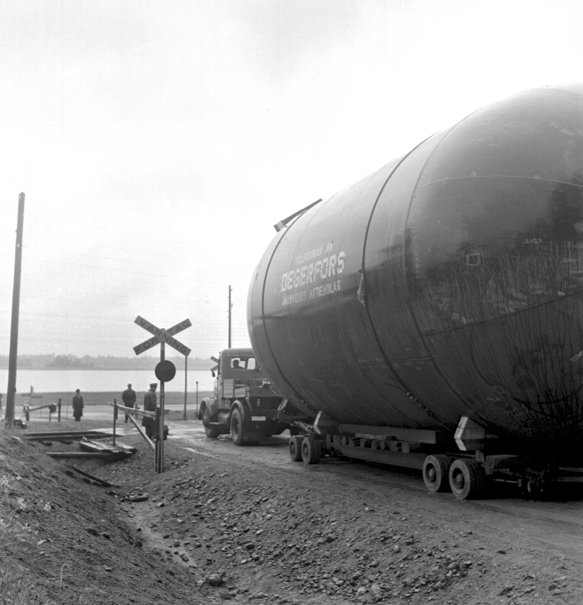Statens Järnvägar, SJ. Sulfitkokare transporteras med vagnbjörn