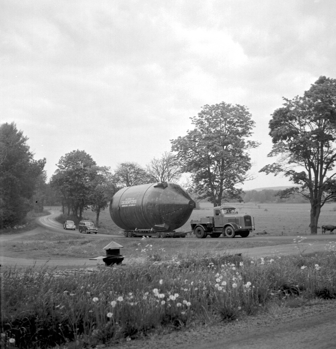 Statens Järnvägar, SJ. Sulfitkokare transporteras med vagnbjörn