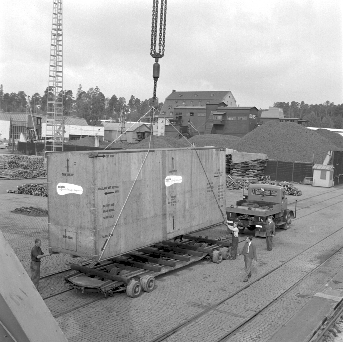 Helikopter i emballage lastas på låglastande släpvagn, vagnbjörn