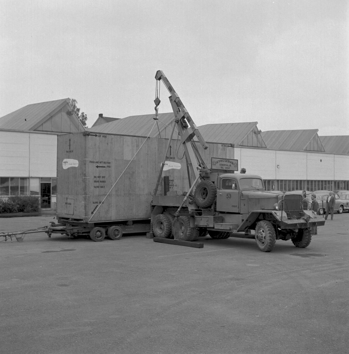 Lossning av helikopter i emballage från låglastande släpvagn, vagnbjörn
