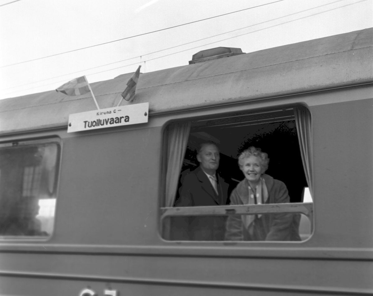 Invigning bansträckan Kiruna C - Tuolluvaara. I fönstret Generaldirektör Erik Upmark och hustrun Maja.