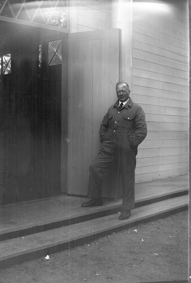 Utställning man vid entren