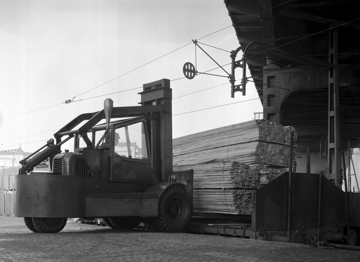 Större gaffeltruck i kajtjänst, Liljeholmen. Lossning av virke