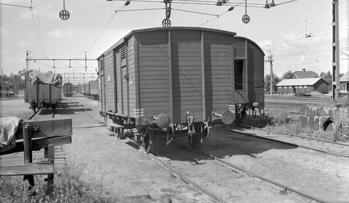 Statens Järnvägar, SJ Gsh. SJ säkerhetstjänst. Godsvagn. Märken på vagnshörnen visar att godstågsbroms icke är godkänd internationellt men kan omställas för persontåg.