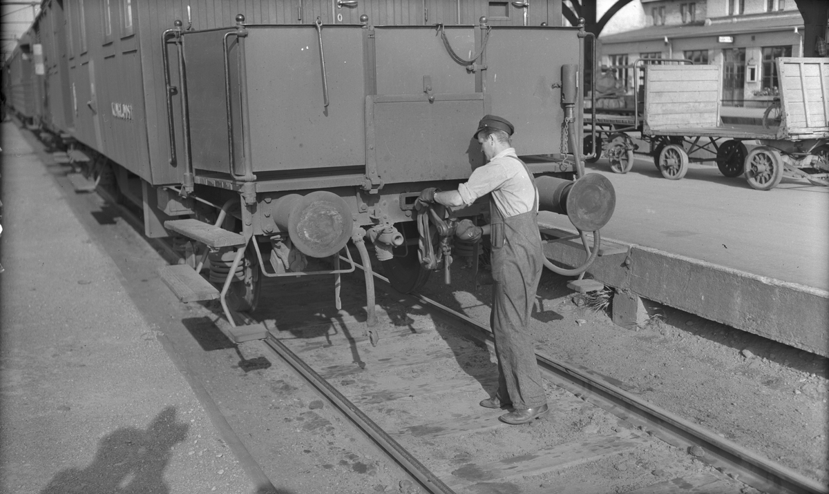 Statens Järnvägar, SJ säkerhetstjänst. Vagnskötare inspekterar vagnar inför resan.