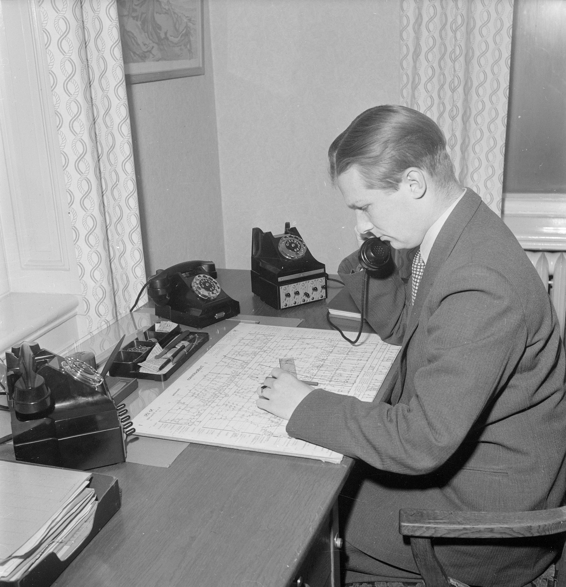 Tågklarerare med uppgift att övervaka tågens rörelser T.H. Lund, Persontaxebyrån. Grafisk Tidtabell.