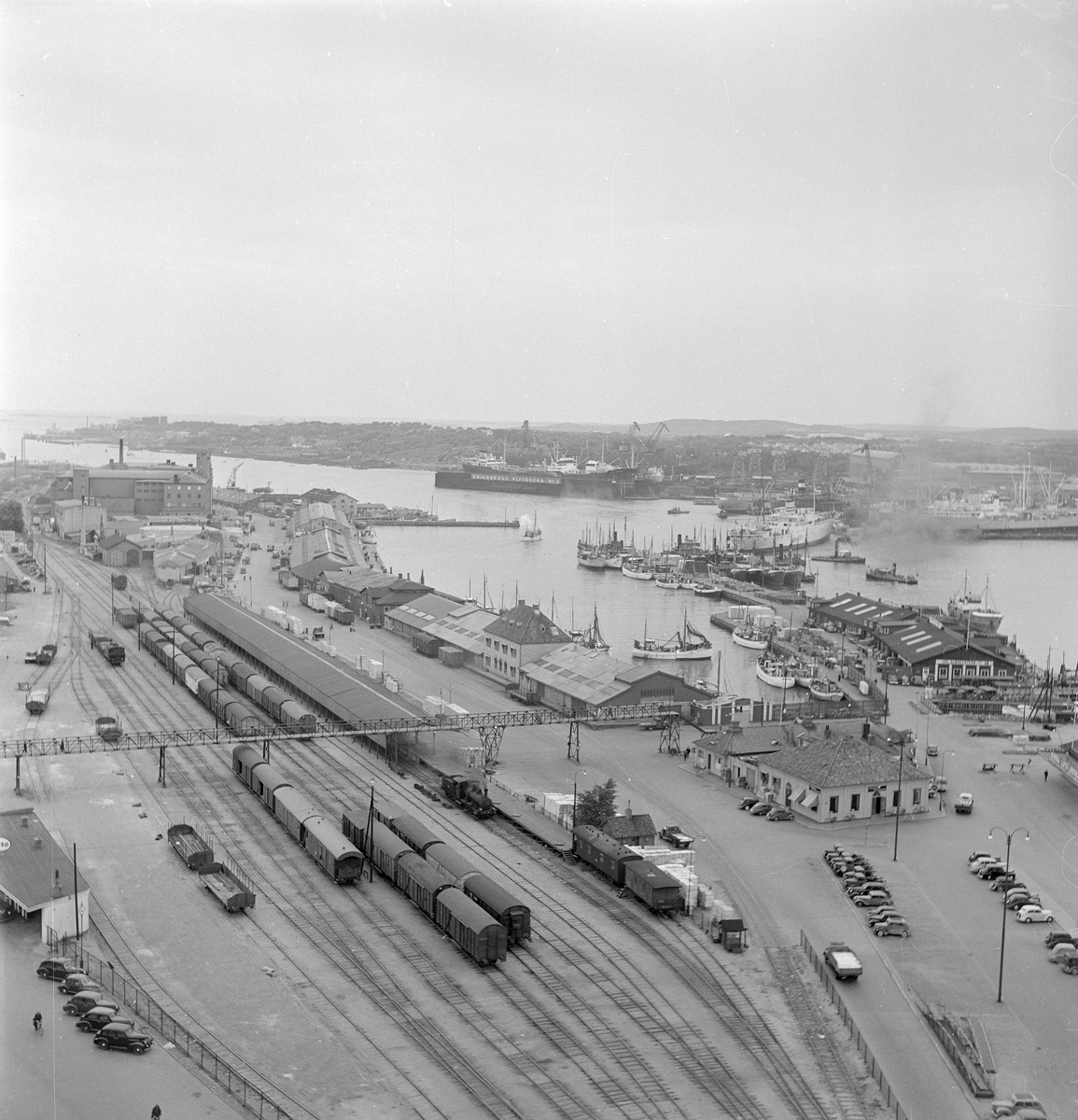Göteborgs hamn. Utsikt över Fiskhamnen och bangården. Ångbåtar. Ånglok.