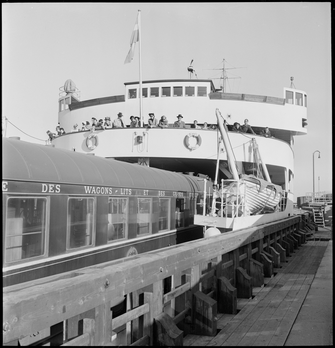 Wagon-Lits-vagnar växlas in på tågfärjan Malmöhus. Text på vagnen DES WAGON LITS