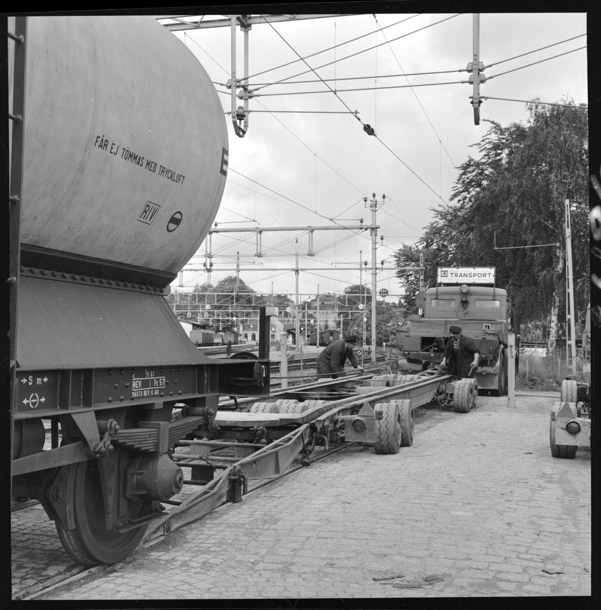 Statens Järnvägar, SJ Q12 506064 tankvagn. Vagnbjörn med dragfordon. Lastning av tankvagn.