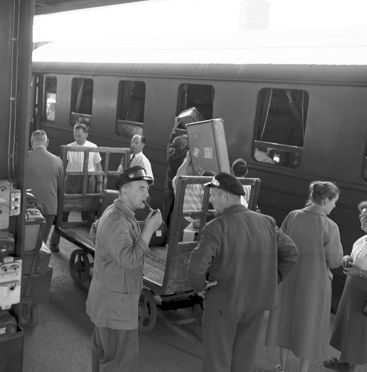Passagerare, resgods och stadsbud på plattformen.