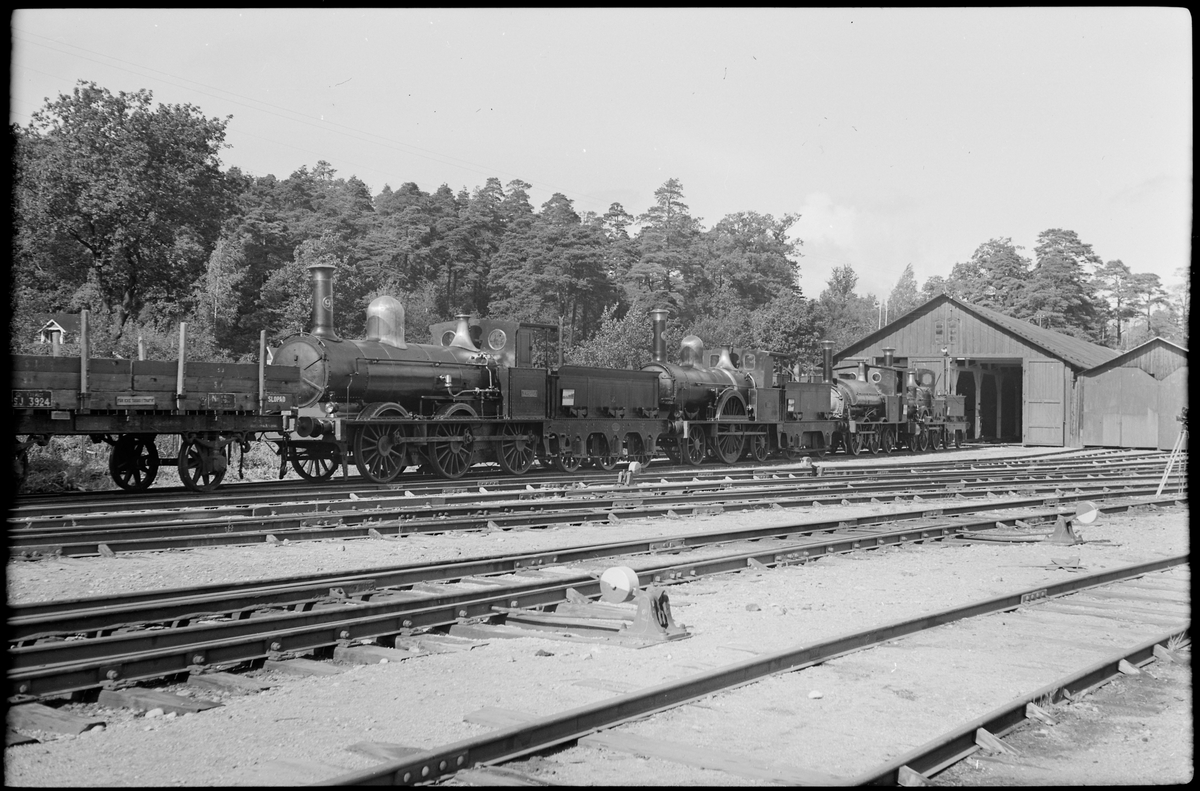 Statens Järnvägar, SJ G 93 "Jernsida", SJ A 75 "Göta", Statens Järnvägsbyggnader, SJB lok 22 "Thor" och SJ B 3 "Prins August" vid järnvägsmuseums lokaler i Tomteboda.
