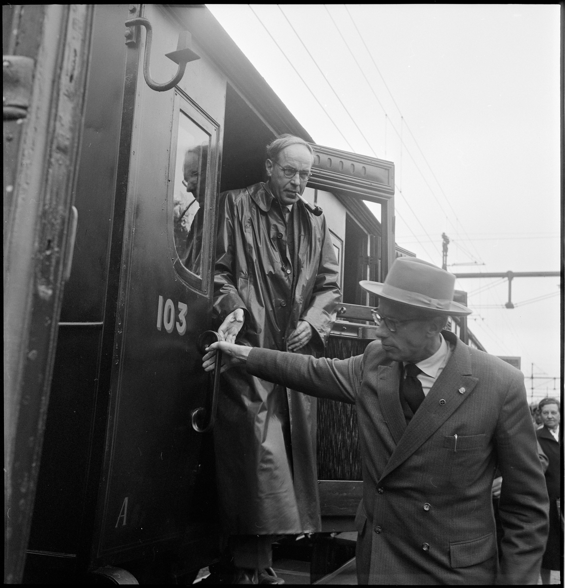 Resa med Statens Järnvägar, SJ B 3 "Prins August" på väg från Stockholm C till Sundbyberg under International Congress of Museums 1959. Resenärer stiger ur personvagn SJ A 103.