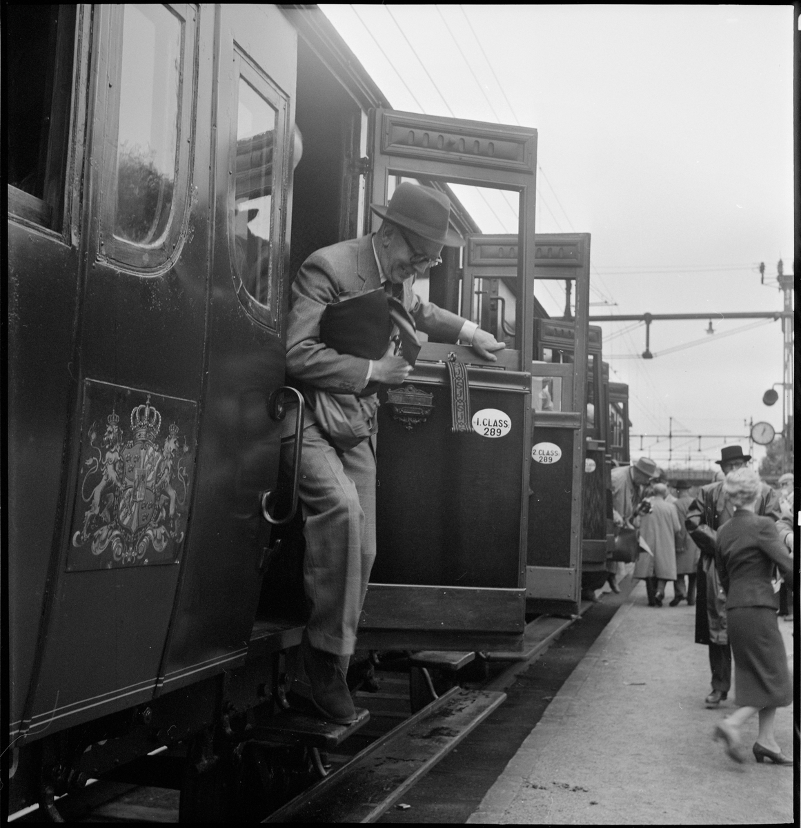Statens Järnvägar, SJ B 3 "Prins August" på väg från Stockholm C till Sundbyberg under International Congress of Museums 1959. Passagerare stiger här ur personvagn SJ AB 289.