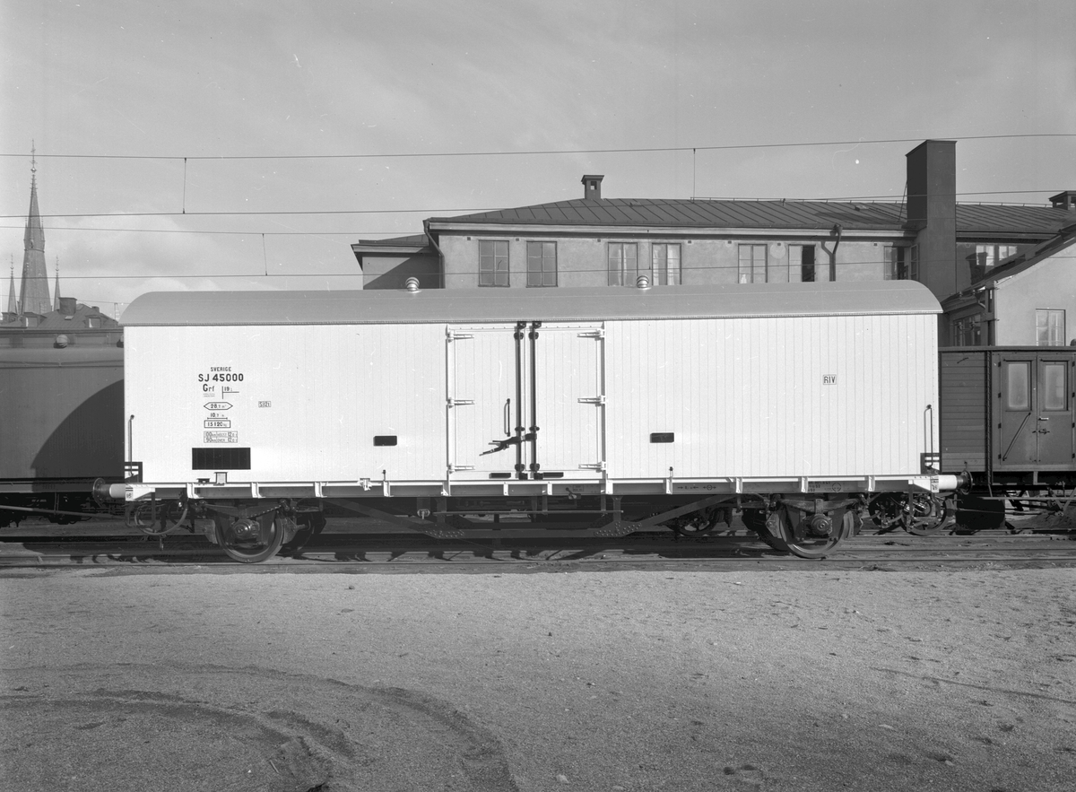 Statens Järnvägar, SJ Grf 45000. Kylvagn isolerad. På vagnshörnan syns märke som betyder internationellt godkänd godstågsbroms som kan omställas till för persontåg.