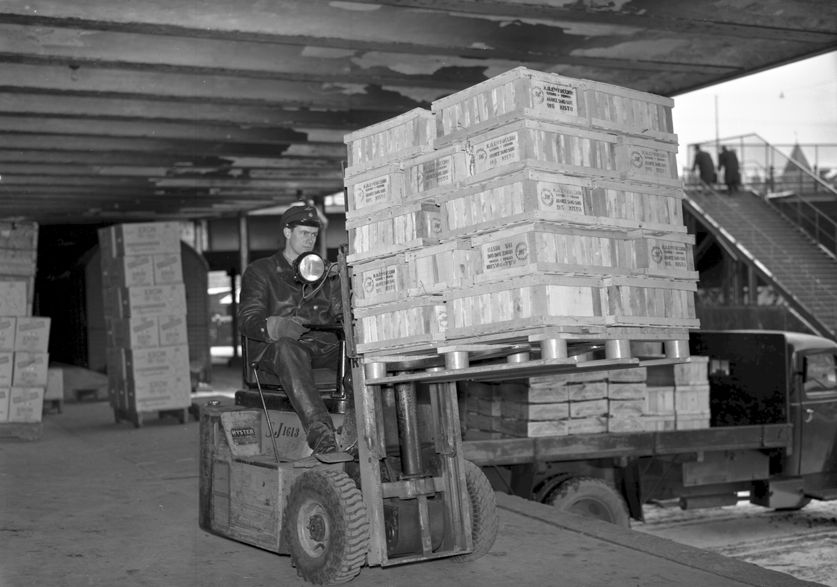 Gaffeltruck av märket Hyster SJ 1G13 med pallastgods.