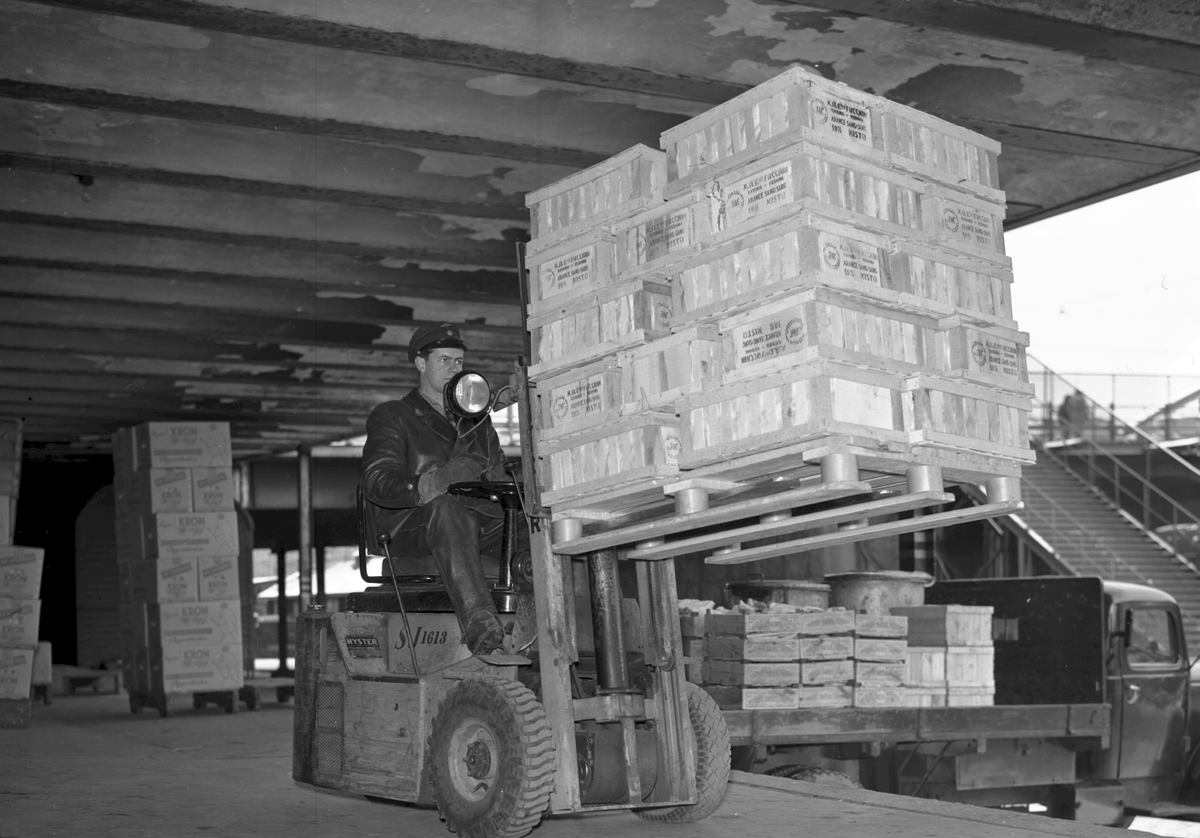 Gaffeltruck av märket Hyster SJ 1G13 med pallastgods.