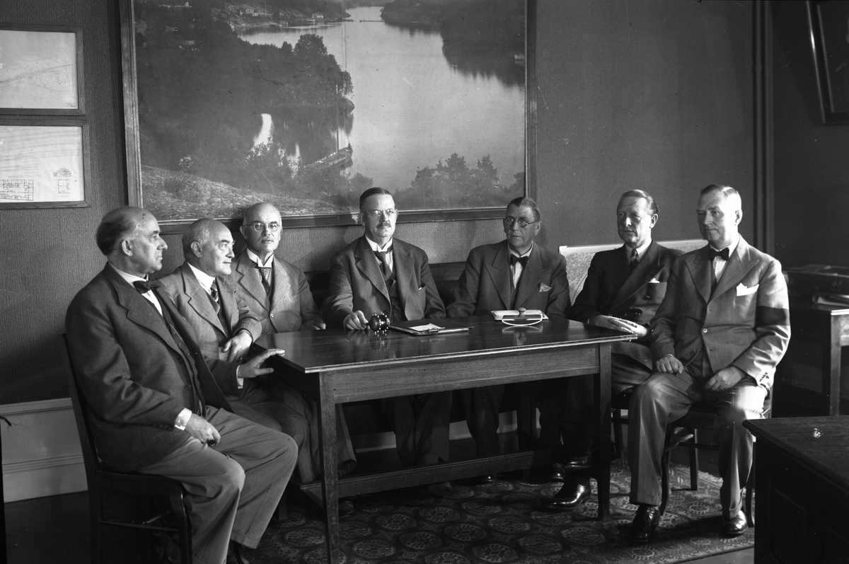 Statsbanornas Tjänstemannaförbunds styrelse. Fr v Överinspektör, Öins Grönqvist Byråingenjör, Briö Abel Sektionsingejör, Siö Holmqvist Förste Trafikinspektör, Fti Söderberg Aktuarie, Ak Pehrsson Doktor, Dr Berger Förste Maskiningejör, Fmiö Påhlsson