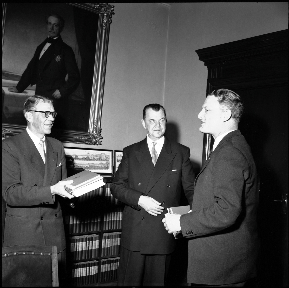 Redaktör Tryggve Ström och Jernbanedirektör Leif Tveten vid överlämnandet av Norske Stadsbanor, NSB gåva till Statens Järnvägar SJ Generaldirektör Erik Upmark.