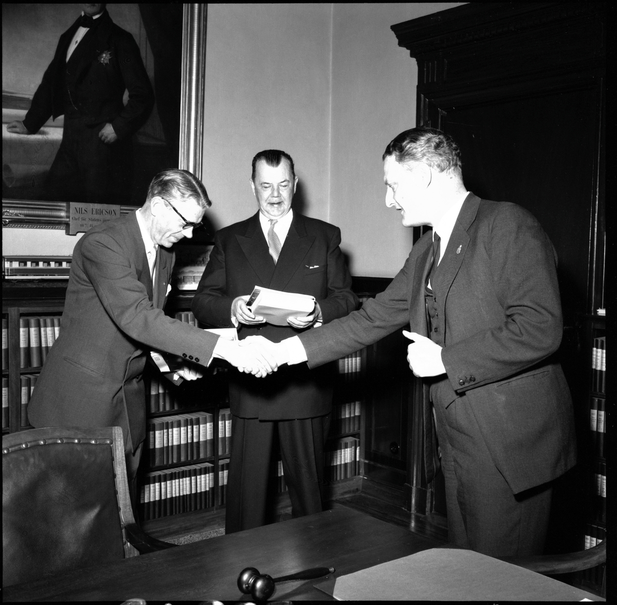 Redaktör Tryggve Ström och Jernbanedirektör Leif Tveten vid överlämnandet av Norske Stadsbanor, NSB gåva till Statens Järnvägar SJ Generaldirektör Erik Upmark.