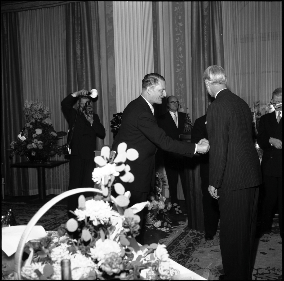 Titel: Generaldirektör Erik Upmark tar emot gåvor från Sydkraft, VEGETE-bolagen, SAL, Sv. Turisthot Riksförbund.