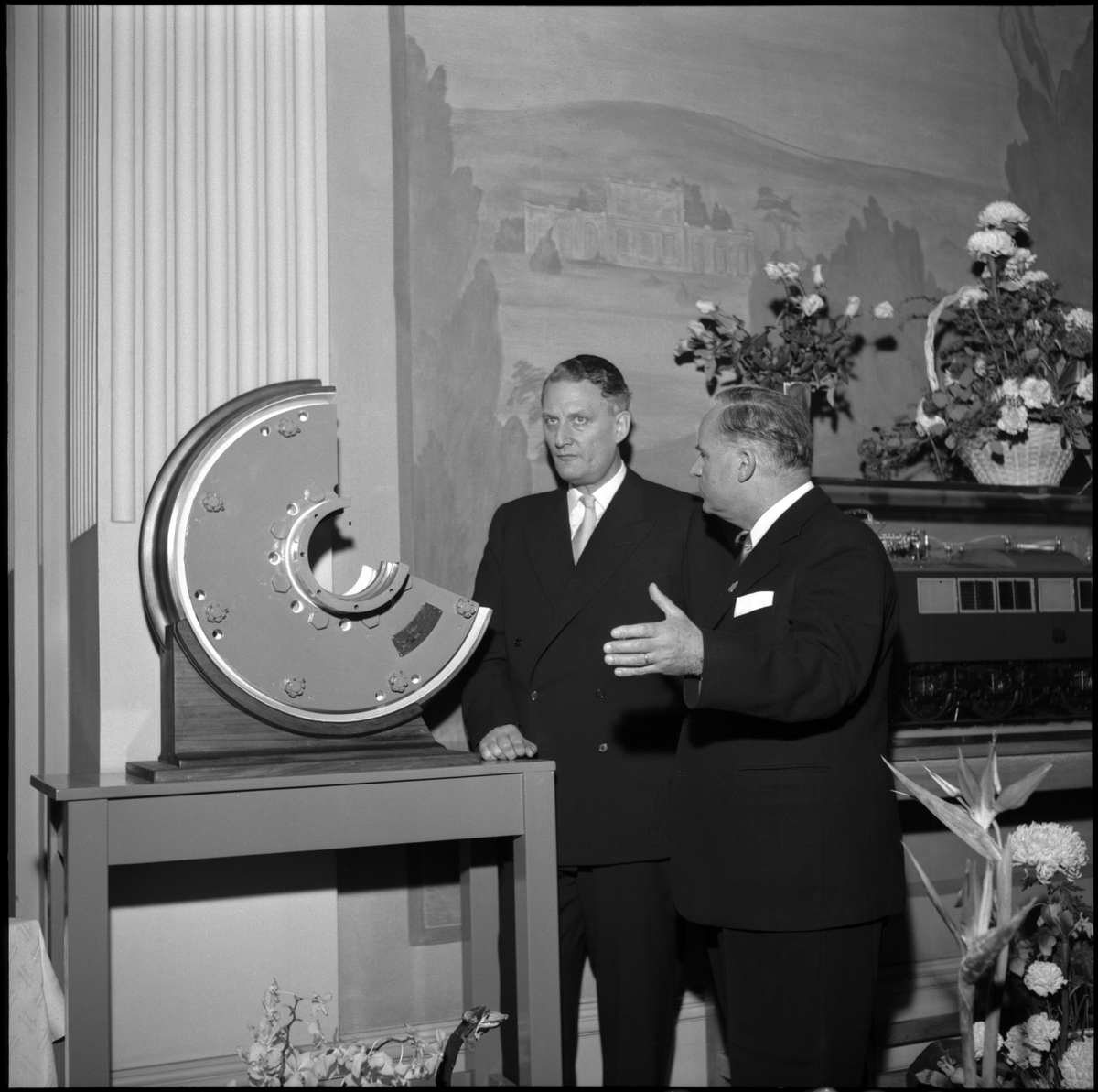 Generaldirektör Erik Upmark tar emot gåvor från Kalmar Verkstad och Motala Verkstad, AB. Genomskuret lokhjul.