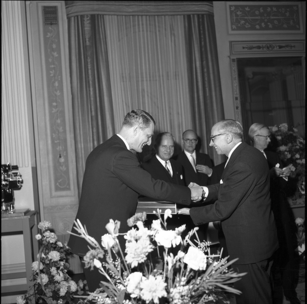 Generaldirektör Erik Upmark tar emot gåvor från Bennets Resebyrå, Vagnfabriken Skandia Köpenhamn med flera.