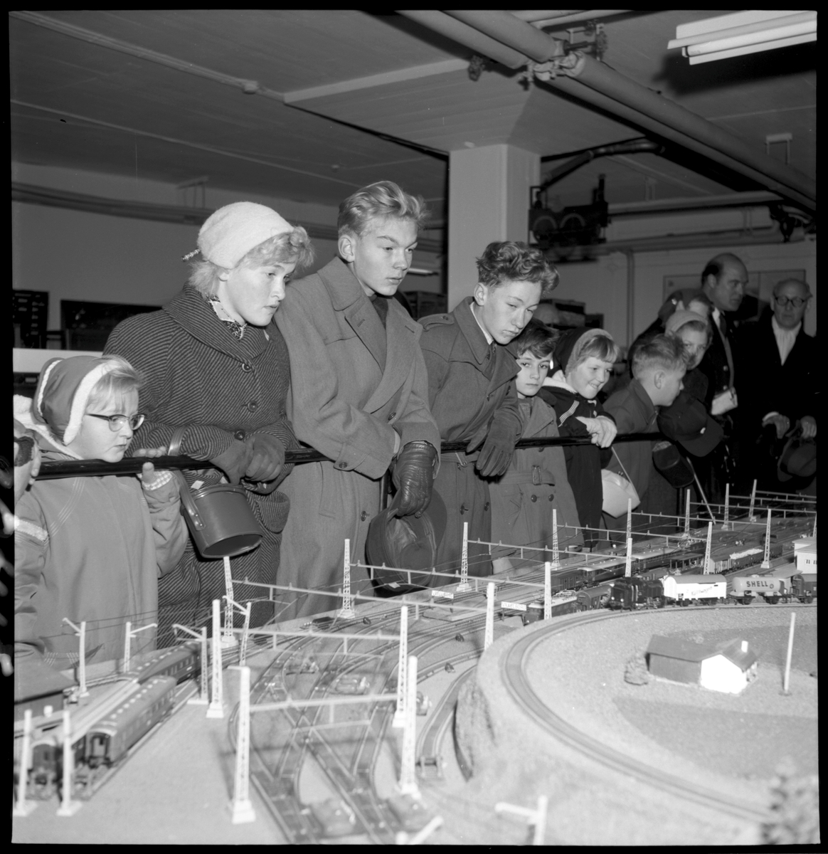 Skolungdomar från Holmön på besöket i Järnvägsmuseét. Intresset både bland gamla och unga är stor för SJ:s modelljärnvägsanläggning.