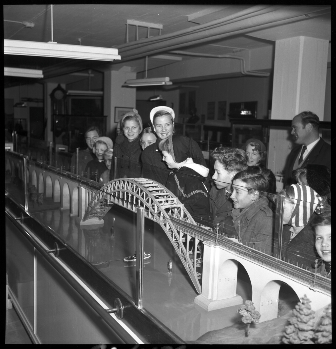 Skolungdomar från Holmön på besöket i Järnvägsmuseét. På bilden syns modell av Årstabron. .