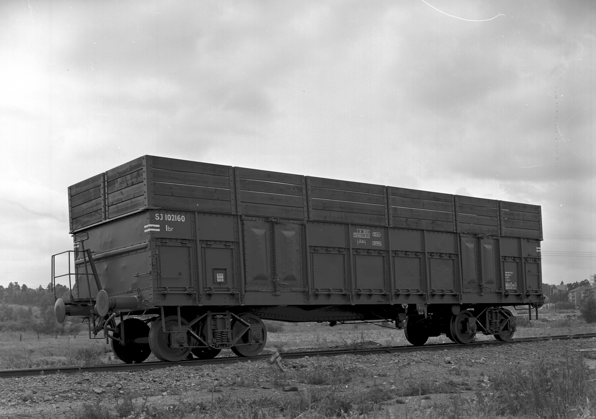 Statens Järnvägar, SJ Ibr 102160. Tidigare littera Bj 4421. Boggivagn med bromsplattform, fällbara sidoluckor och kokospåbyggnad. Ibr vagnar sattes i trafik på 1950-talet för kokos transport från Stockholm och Luleå till Domnarvet. De var kvar i trafik till slutet av 1970-talet.