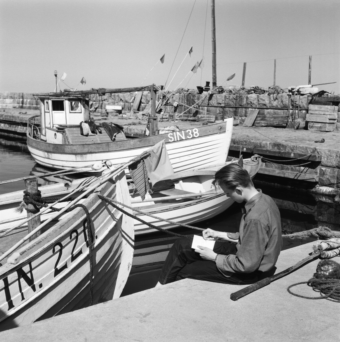 Titel: Läroverkselever besöker Baskemölla fiskeläge. (Foto i samband med Blackebergs Lärov. tåghem)