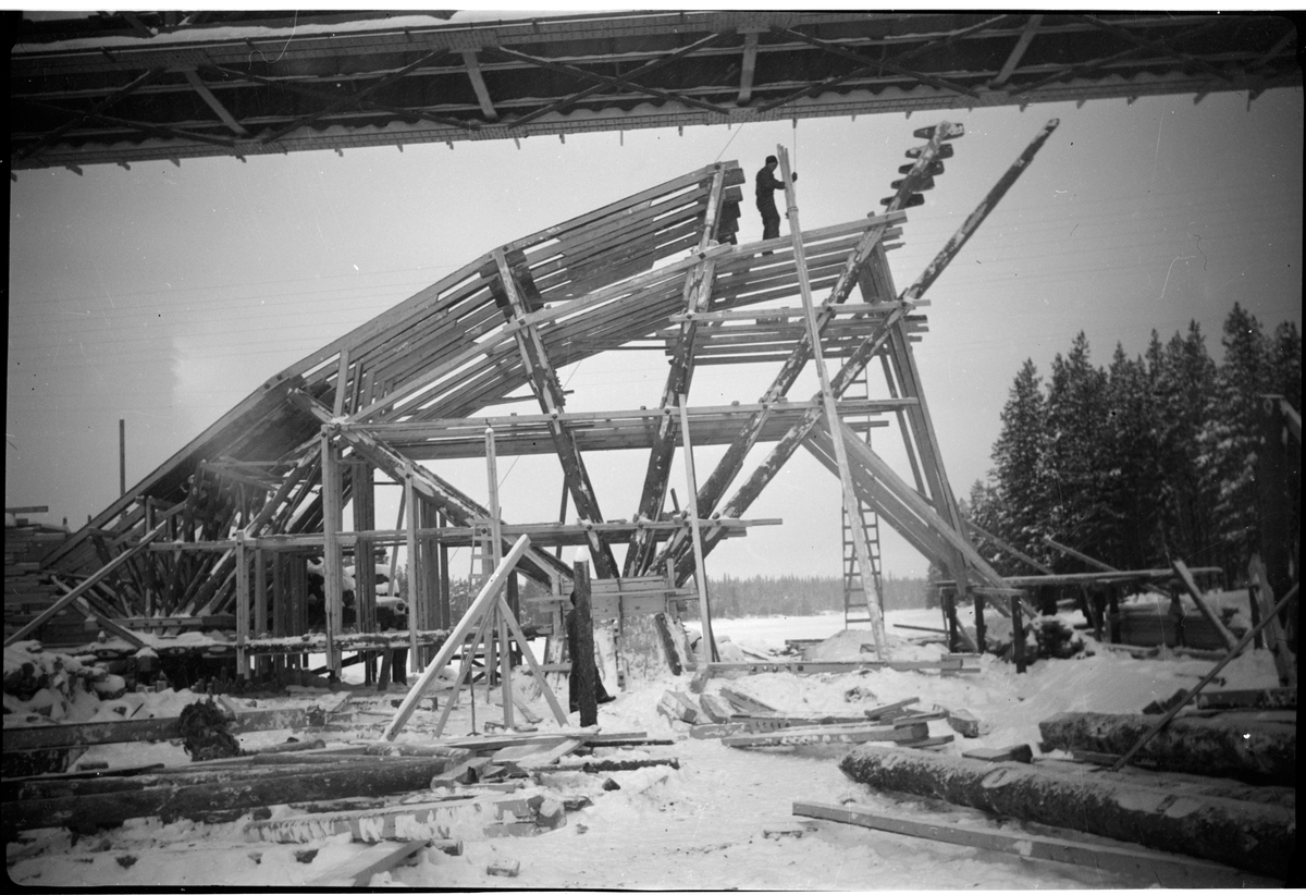 Titel: Bild från bygget av en ny bron över Byskeälven vid Myrheden. Observera att den nya bron byggdes under den befintliga fackverksbron. Bron byggdes om 1941.