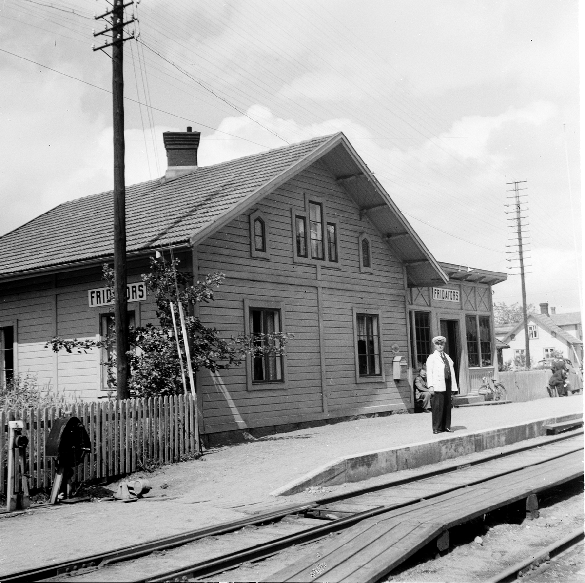Fridafors järnvägsstation. Stationspersonal i sommaruniform. Ställbock till vänster.
