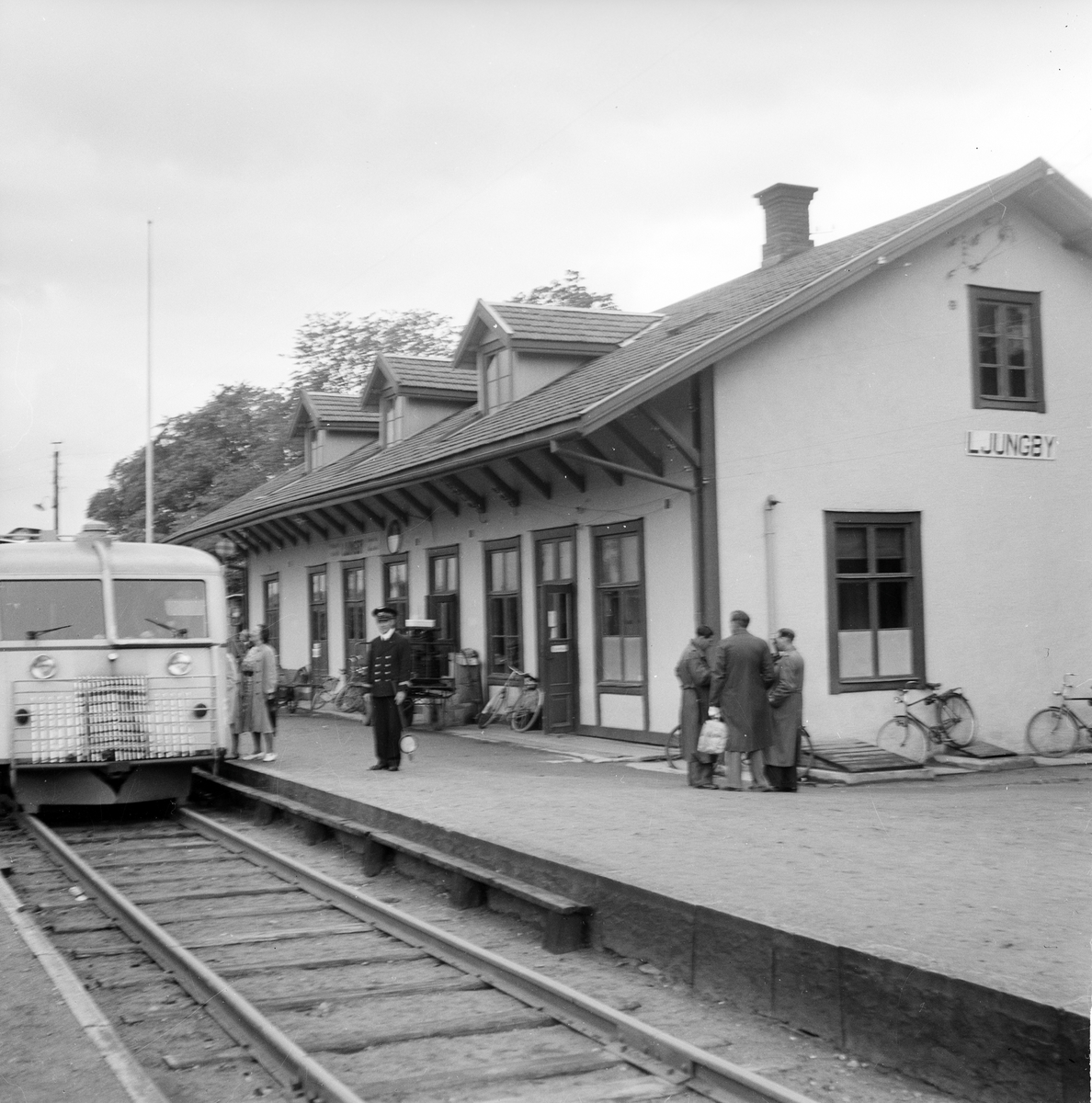 Statens Järnvägar, SJ Y01. På plattformen står resande och en stins.