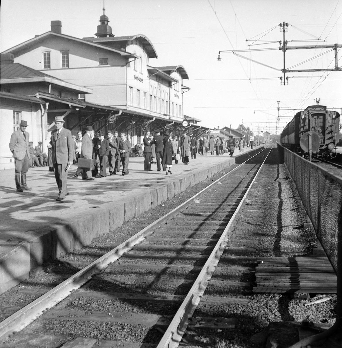 Resenärer vid Skövde station. Till höger på bilden ett persontåg.