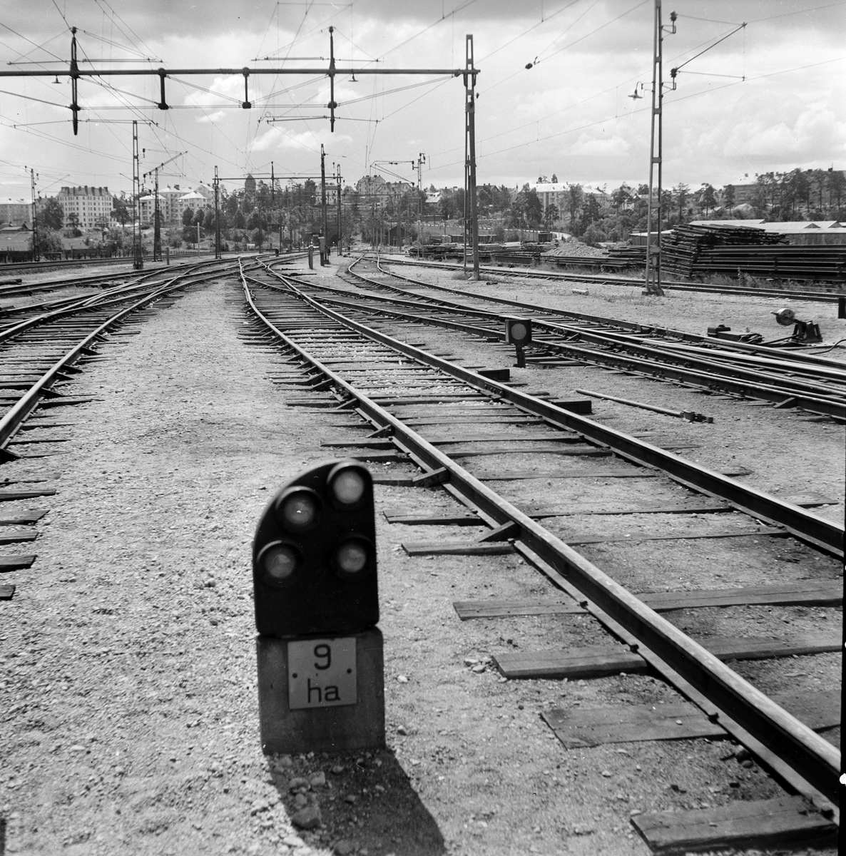 Harplinge bangård med samhället i bakgrunden. I förgrunden en dvärgsignal.