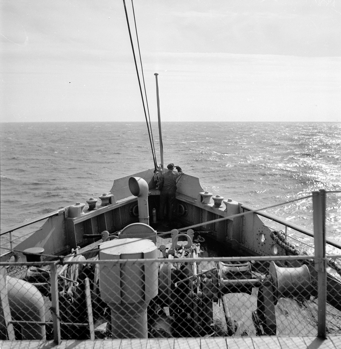 Krigsfångeutväxling i Trelleborg. En man står i fören och ser ut över havet.