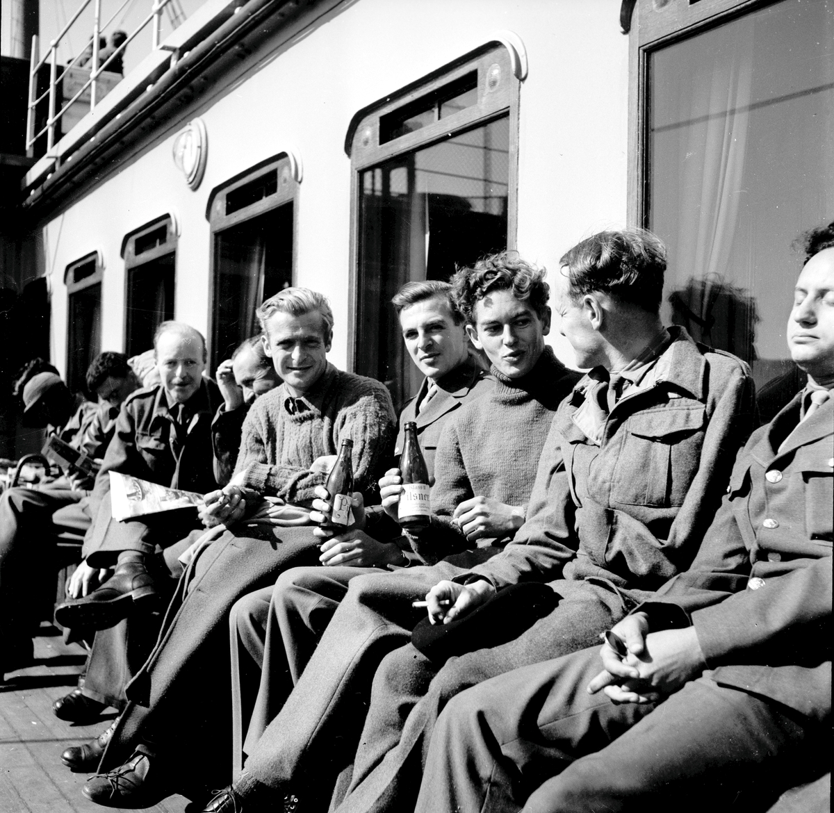 Krigsfångeutväxling i Trelleborg. Männen dricker pilsner och läser tidning.