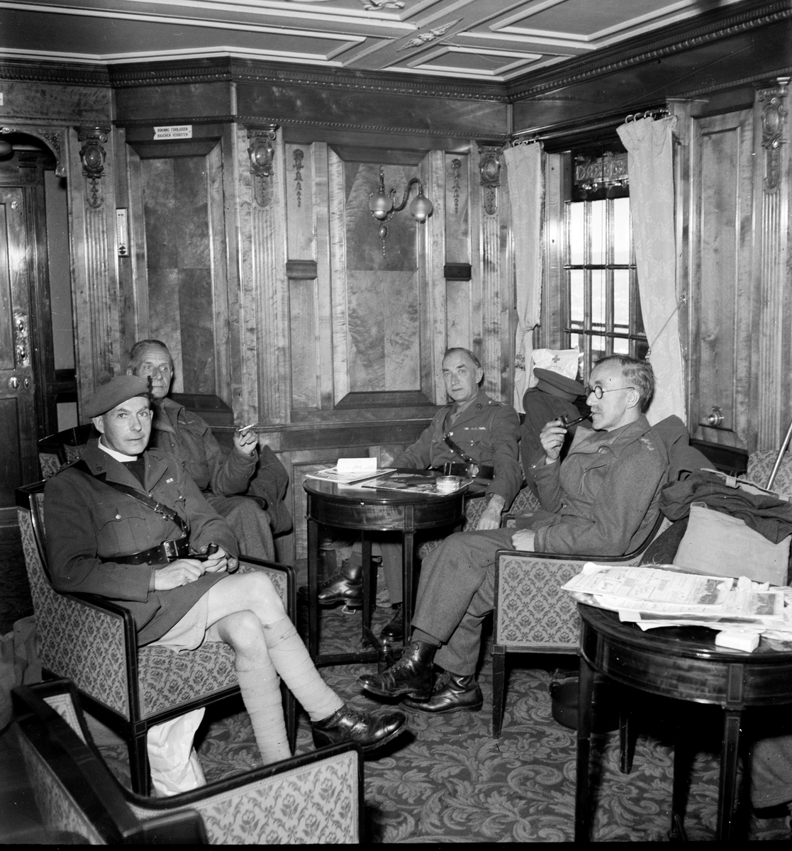 Krigsfångeutväxling i Trelleborg. Männen sitter och röker i ett rum där det är rökning förbjudet.