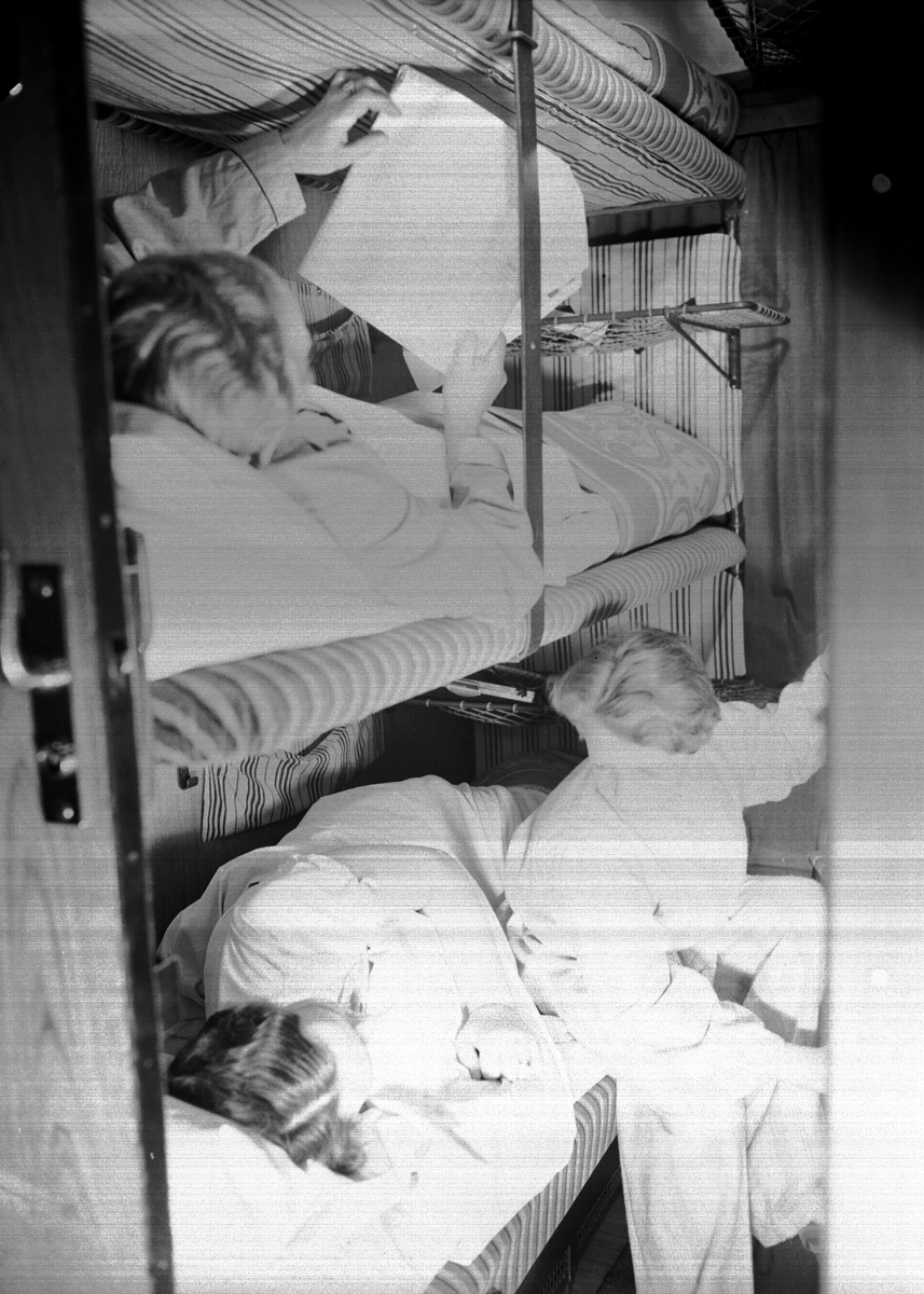 AB02c, 3:e klass sovvagn. Mannen ligger och läser tidningen.