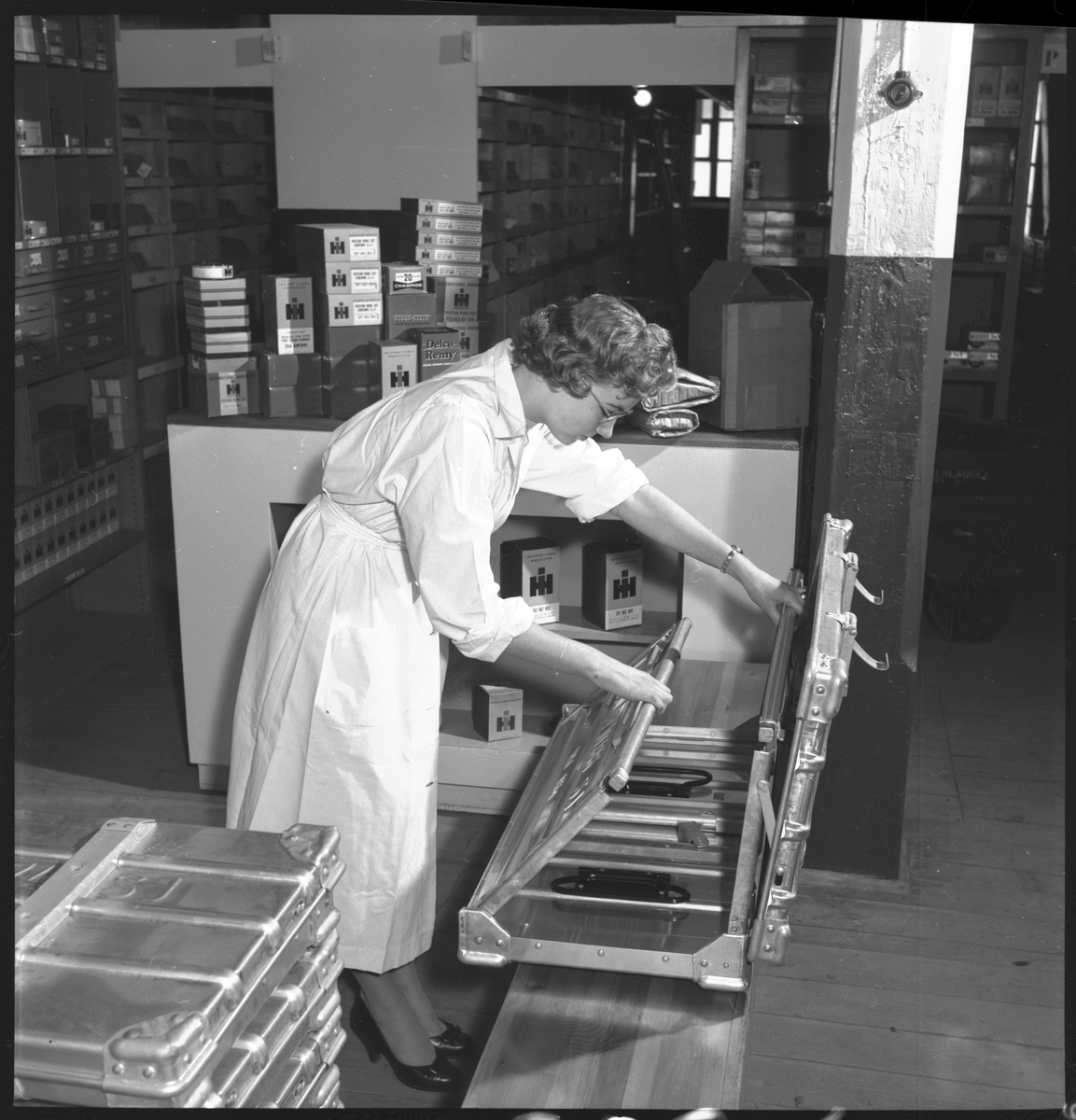 Kvinna instruerar hur man monterar småbehållare SJ La 10386, hopfällbar box av plåt.
