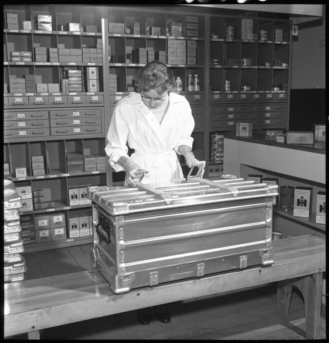 Kvinna instruerar hur man monterar småbehållare SJ La 10386, hopfällbar box av plåt.