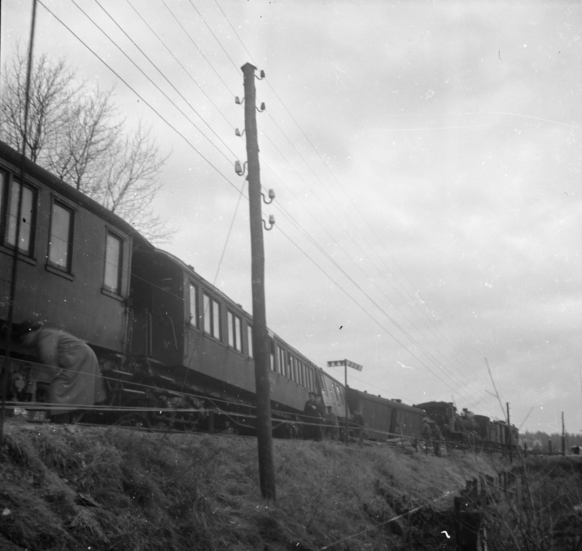 Från vänster till höger syns en personvagn, personvagn HNJ 1011, postvagn HNJ 19 resgodsvagn HNJ F3 761 samt ånglok HNJ 28. Längst till höger syns ett till tåg med ånglok och två vagnar.