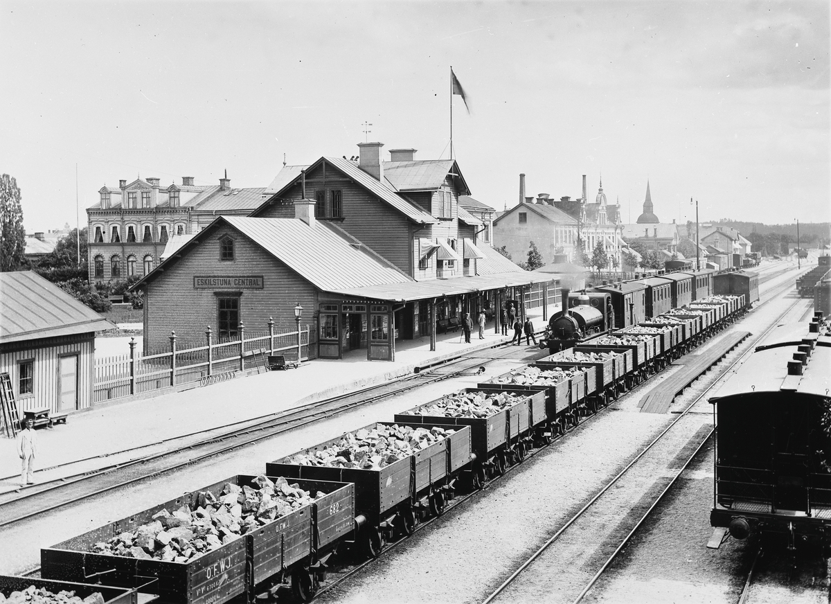 Eskilstuna Central gamla stationshus, sedd från bangården. Stationen byggdes av Oxelösund - Flen - Västmanlands Järnväg, OFWJ, 1876. Namnet Eskilstuna Central tillkom 1895 då Norra Södermanlands Järnväg öppnade Eskilstuna Norra och Esilstuna Södra station.