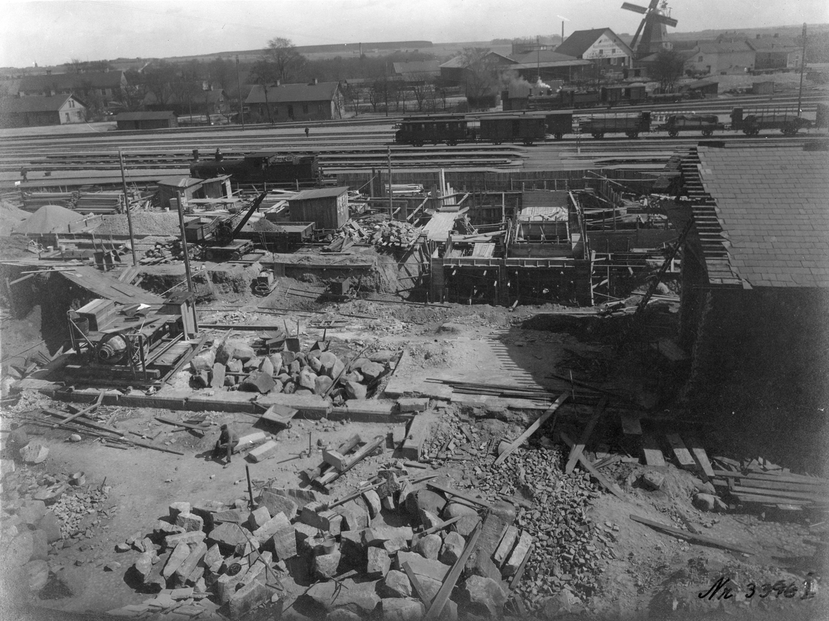 Stations- och tunnelbyggnad vid Eslöv järnvägsstation. I bakgrunden skymtas en väderkvarn.