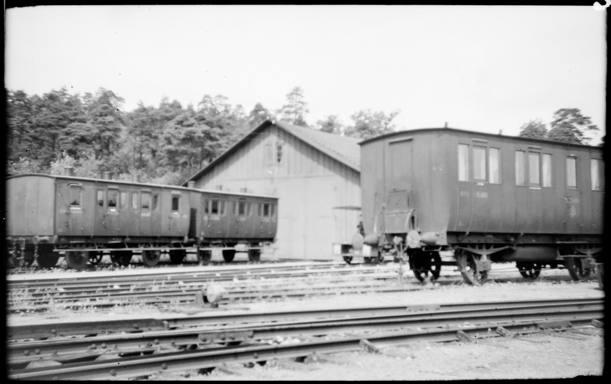 Tre av järnvägsmuseums personvagnar vid lokalerna i Tomteboda.