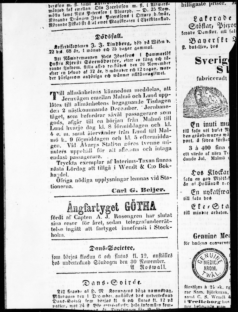 Titel: Tidningsklipp från 29/12 1856 med Södra Stambanans första tidtabell.