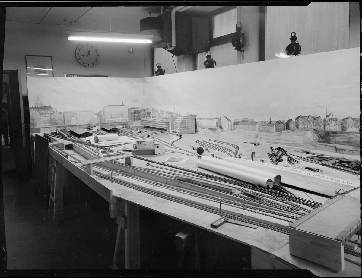 Elektrisk modelljärnväg, under uppbyggnad, föreställande linjen Stockholm Södra - Älvsjö.
