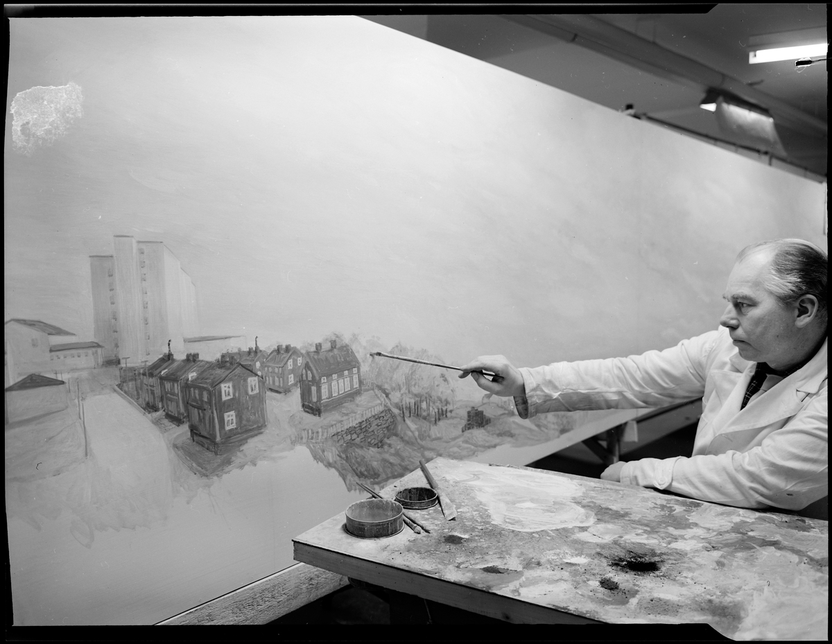 Bakgrunden till modelljärnvägen skapas av konstnären G. Palmgren. Stockholm södra - Älvsjö.