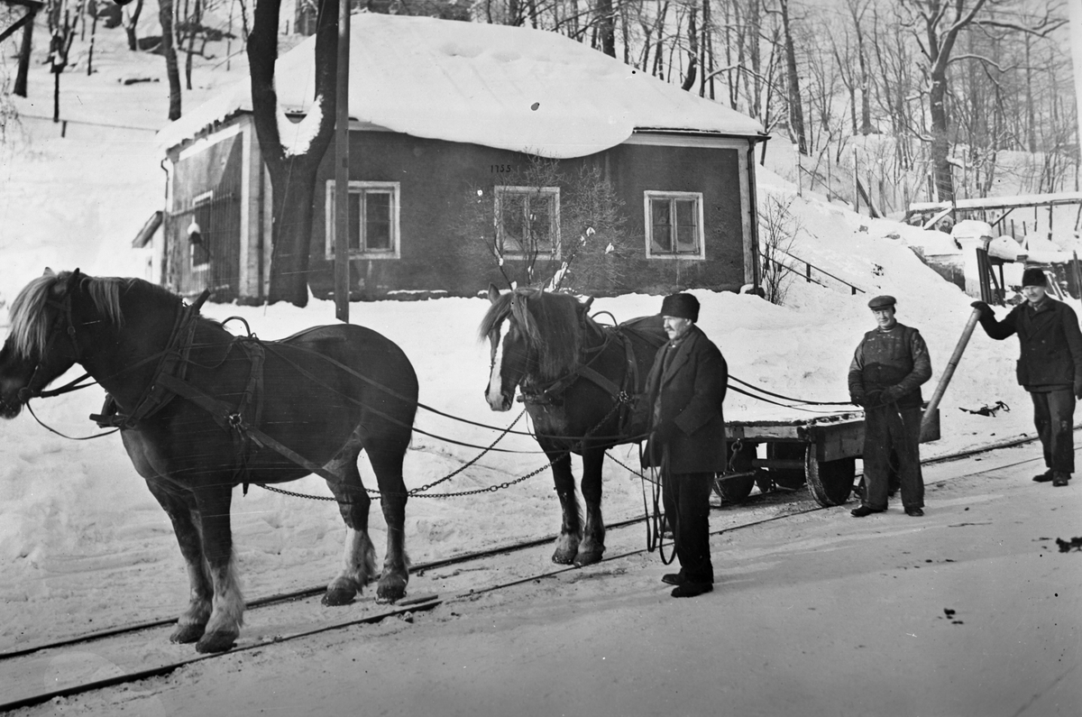 Titel: Trallvagn med hästar. Dagsverkarbostad uppförd 1755. Smalspårsbana. Hästbana.