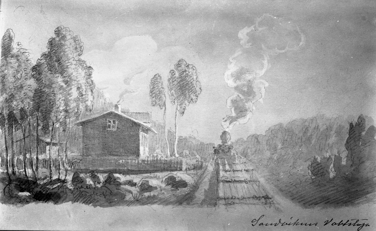 Vaktstugan. Ur Adelskölds skissbok.Foto av teckning.